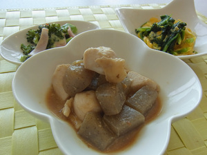 2.こんにゃくは1.5cm角に切り、塩もみして水洗いしてから、2、3分下茹でします。
