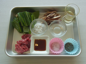 1.しいたけは薄切りにします。フライパンに油を少量熱し、牛肉を炒めます。