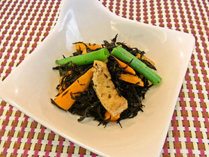 3.ご飯がパラパラしてきたら、ひじきの炒り煮を加えて炒めます。