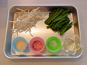 1.にらを5cm位に切ります。もやしを水で洗います。